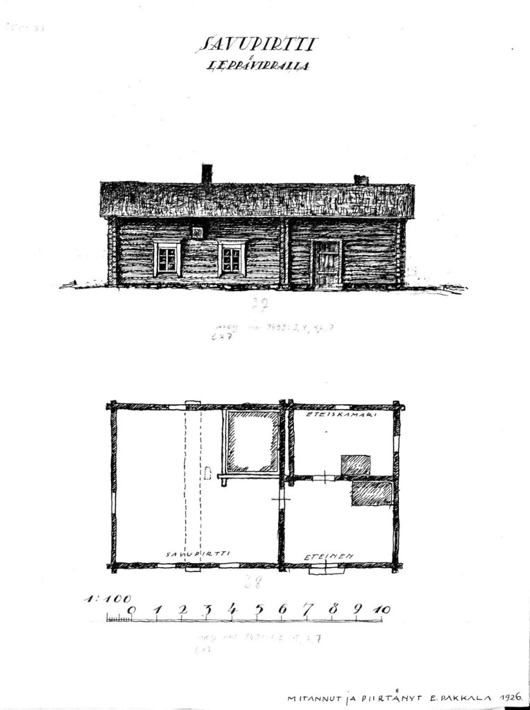 Esimerkki rakennusdokumentoinnin piirroksista. Tuppurilanmäen savupirtti ulkoa sekä pohjapiirrustus. Mitannut ja piirtänyt stipendiaatti Erkki Pakkala 1926.