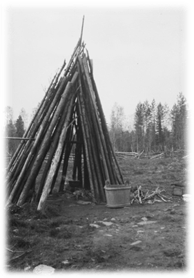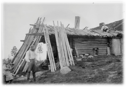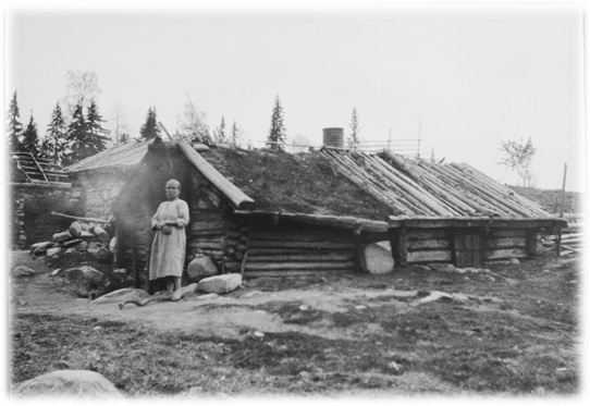 Kuva Kuopion kulttuurihistoriallinen museo. Paavo Sorsan ulospäin lämpiävä savutupa Säyneisistä Juukaan vievään maantien varrella. ”Se oli viime talvena korjattu uloslämpiäväksi. Tupa oli muuten tunnettu siitä, että läänin maaherra oli käväissyt ohi ajaessaan sitä katsomassa, jolloin sen ystävällinen emäntä oli tarjonnut hänelle kahvia kumoon käännetyn pytyn pohjalla. Minulla oli myös kunnia juoda kahvia samassa paikassa, mikä toimitus näyttää Savossa vastaavan intiaanien rauhanpiipun polttamista.” Stipendiaatti Aulis Rissanen 1927.