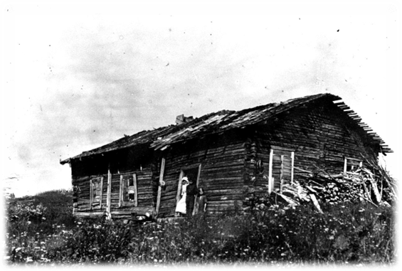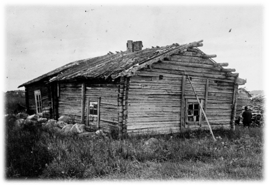 Riekkisen savutupa Laarinvaaralla. ”Kävin myös ottamassa valokuvan Laarinvaaralla olevasta Riekkisen savutuvasta, jossa oli kota eteisessä.” Stipendiaatti Aulis Rissanen 1927.