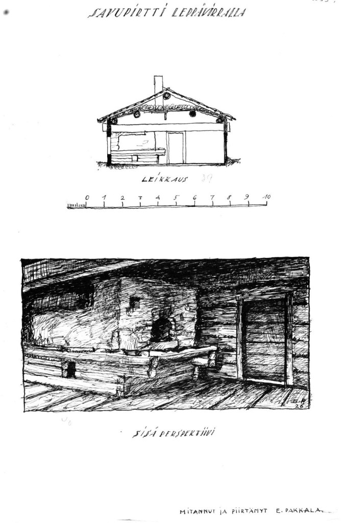 Esimerkki rakennusdokumentoinnin piirroksista. Tuppurilanmäen savupirtin poikkileikkaus sekä kuvaus sisältä. Mitannut ja piirtänyt stipendiaatti Erkki Pakkala.